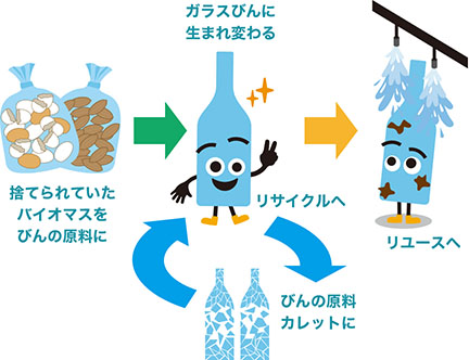 - 再生可能※1なバイオマス※2の廃棄物をガラスびん原料にアップサイクル※3して天然資源の使用量を減らす