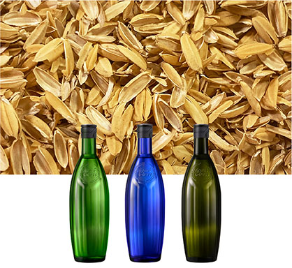 捨てられているお米のもみ殻をガラスびんの主な原料の一つである「けい砂(シリカ)」の換わりに使ってガラスびんを製造する技術を開発し、工場で製造できるようにしました。再生可能資源の原料化で新たなガラスびんの可能性を実現しました。