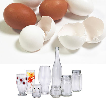 捨てられている鶏の卵の殻をガラスびんの主な原料の一つである「石灰石(炭酸カルシウム)」の換わりに使ってガラスびんを製造する技術を開発し、実際に原料として使用しています。再生可能資源の原料化でガラスびんの「3R+リニューアブル」を実現しました。